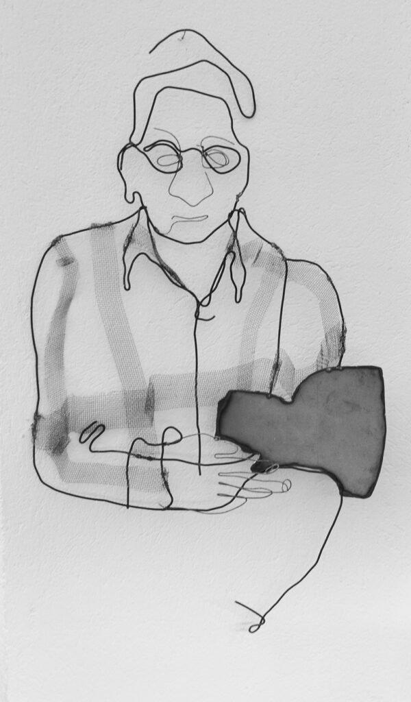This 2-dimensional sculpture is made of iron plate and wire. It is a portrait of my husband, Alberto, who is a handy cheap model! The book he is reading is made of iron plate cut out using a blow torch. The wires are of different calibres for the different parts and the checks on the shirt are made from a special mesh that can be shaped in several ways.