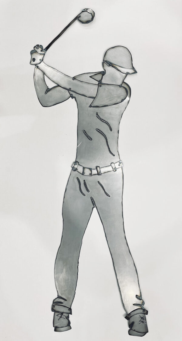To create this sculpture, I first make a drawing of the figure I want to create. I then enlarge it to the required size. Using tracing paper, I draw the shapes I’ve decided I need to make my sculpture. Using carbon paper, I draw the shapes on cardboard, which I then cut out. These shapes serve as a template for repeating the sculptures. I then place the templates on the iron sheet, which I then cut with a laser torch. I clean the edges with a radial angle grinder and then weld them with a spot welder. This iron sculpture represents the passion and precision of a golfer in action. Every detail captures the energy and movement of the precise moment of the shot. Its robust yet elegant style will be a magnetic focal point in any indoor or outdoor space.